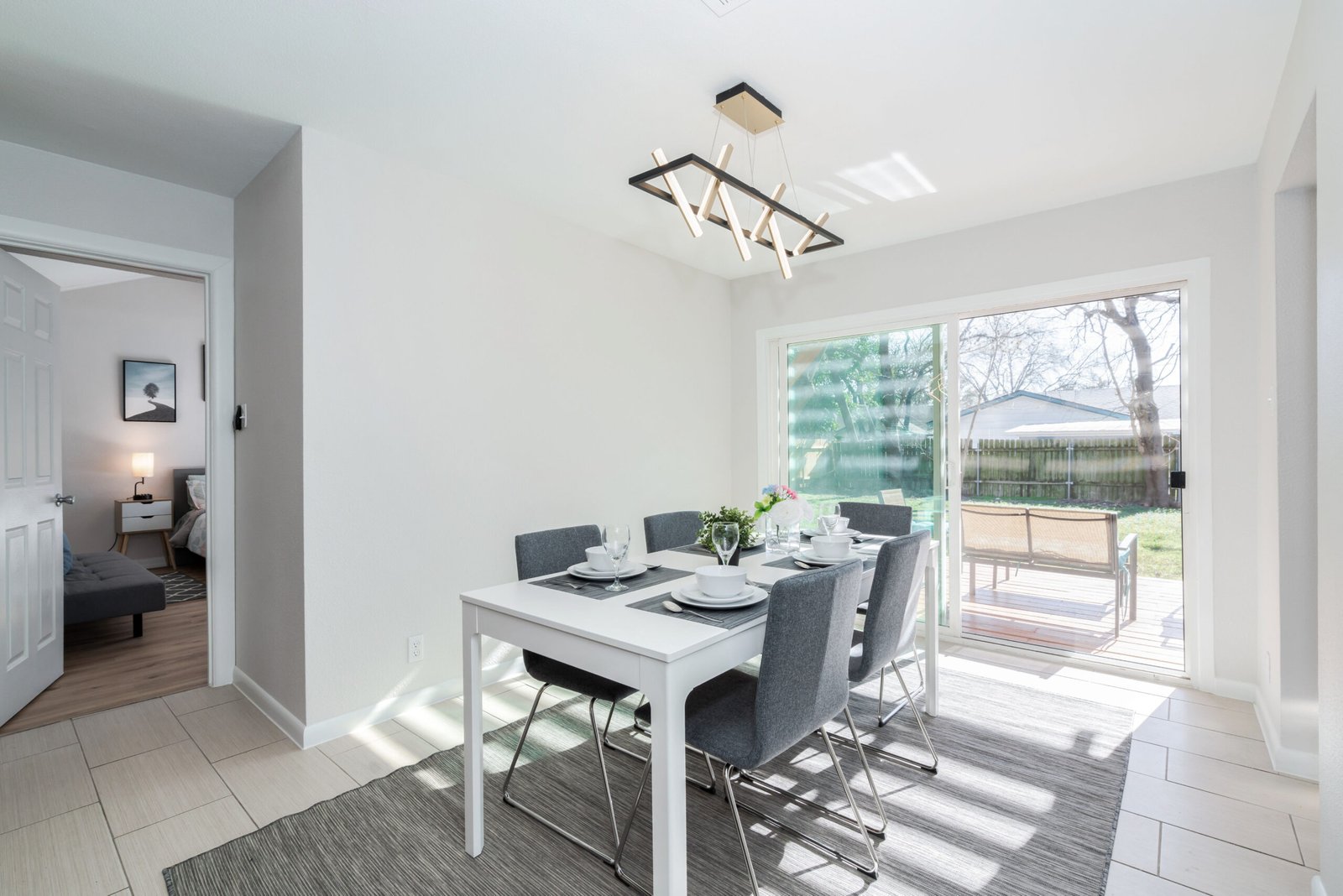 Located in a quiet neighborhood yet only a short drive from DT. this inviting split floor plan home has a living space that features abundant natural light, high ceilings, and flows directly into the airy dining room with a view to the deck and backyard. The high ceiling master suite features large bay windows, an in-suite bathroom with walk in shower, and a large walk-in closet. Two bright additional bedrooms both with large closets and a finished garage complete the interior of this lovely home. Head outside to take in your beautiful green living space with a brand new deck and patio furniture!